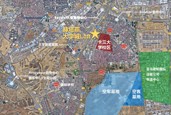 房产位置优越,紧邻城铁,15分钟直达马德里市中心。临近空军/空客基地、亚马逊国际物流中心,客源丰富稳定